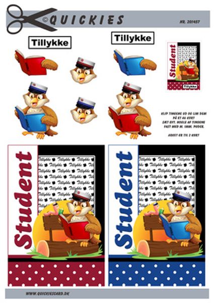 Studenter ugle, rød og blå bånd, Quickies card, 10 ark